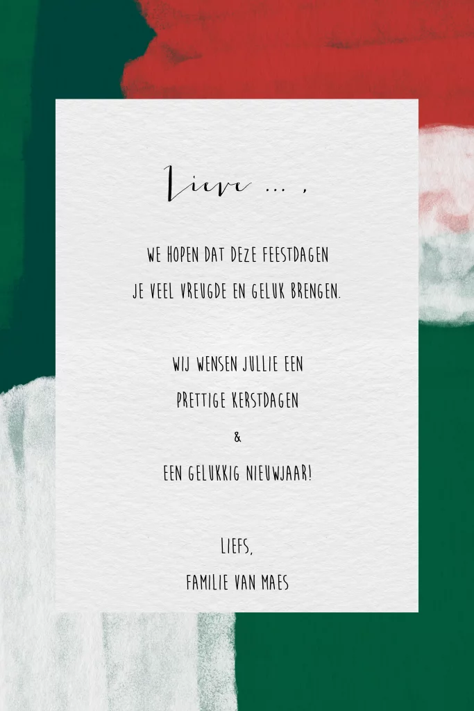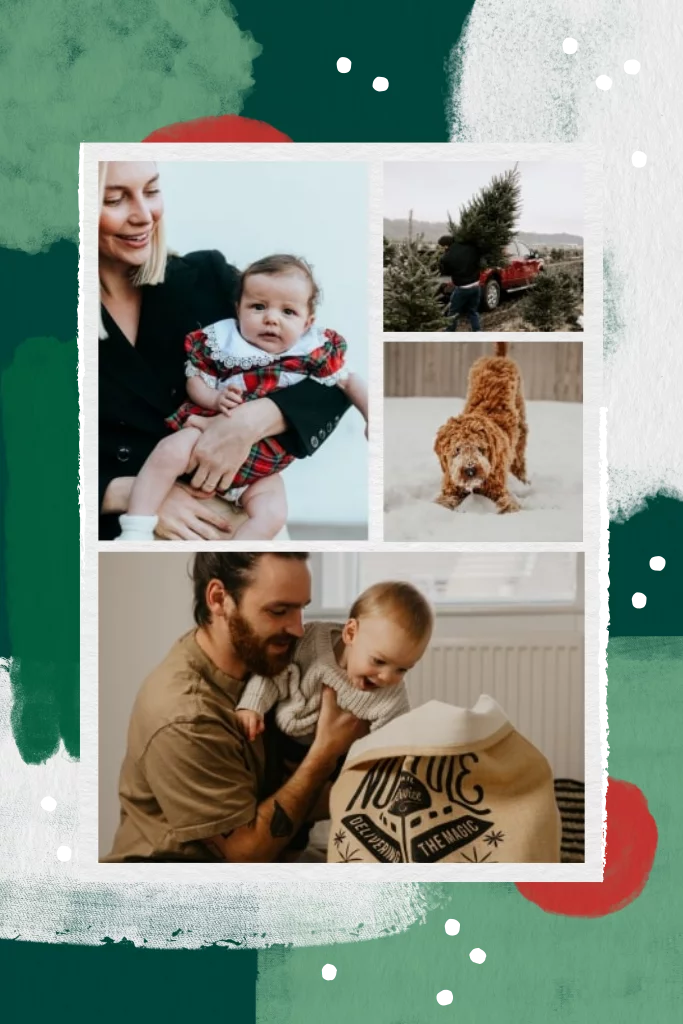 Kerstkaart in vrolijke kerstkleuren met ruimte voor vier foto's aan de voorkant en twee aan de binnenzijde. Wens je familie en vrienden fijne feestdagen met deze kerstkaart in groen, rood en wit. Upload mooie foto's en pas de teksten aan in de editor voor een persoonlijke kerstwens!