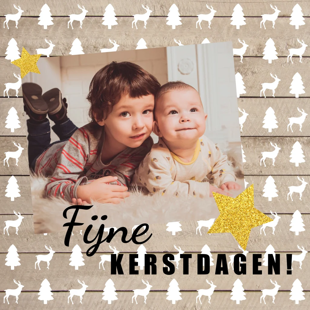 Superleuke kerstkaart met een hip patroon van rendieren en kerstbomen op een houten achtergrond. De goudkleurige sterren maken het kaartje helemaal af! Plaats een mooie foto van jullie gezin, je kinderen of je huisdier op de voorkant, pas de teksten aan in de editor en verstuur deze kaart naar je familie en vrienden!