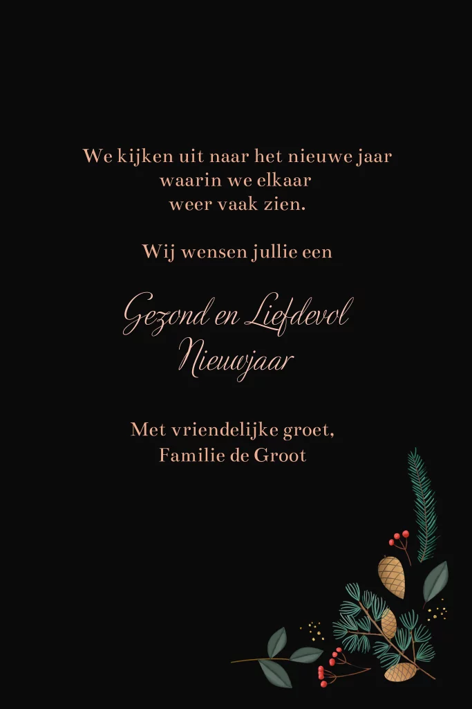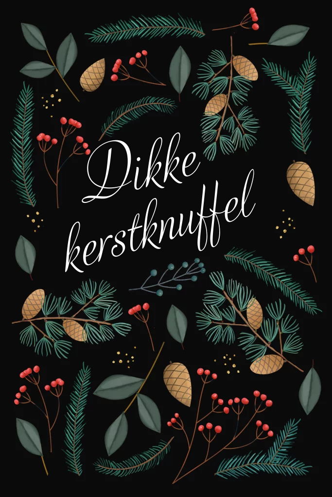 Een kerstkaart met getekende dennentakjes, dennenappels, blaadjes en besjes op een zwarte achtergrond. De tekst op de voorkant staat in goudfolie.