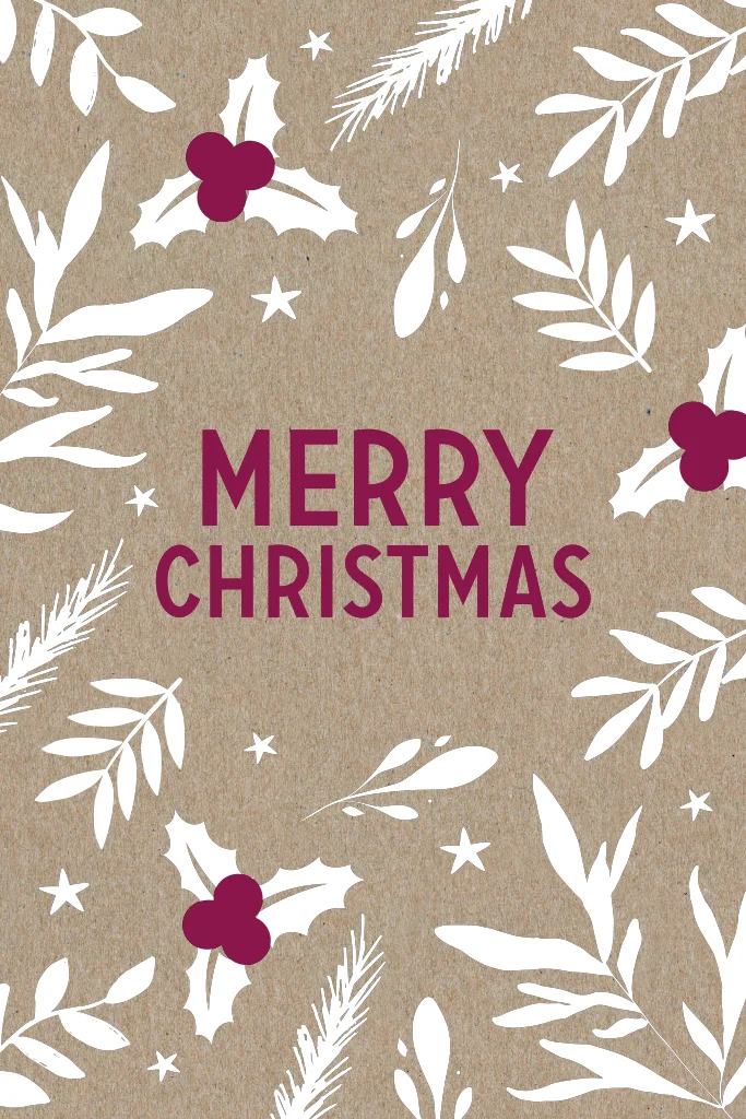 Een vrolijke kerstkaart van kraft met een patroon van rode en witte kersttakjes. Pas de tekst naar wens aan in de online editor voor een persoonlijke kerstwens.