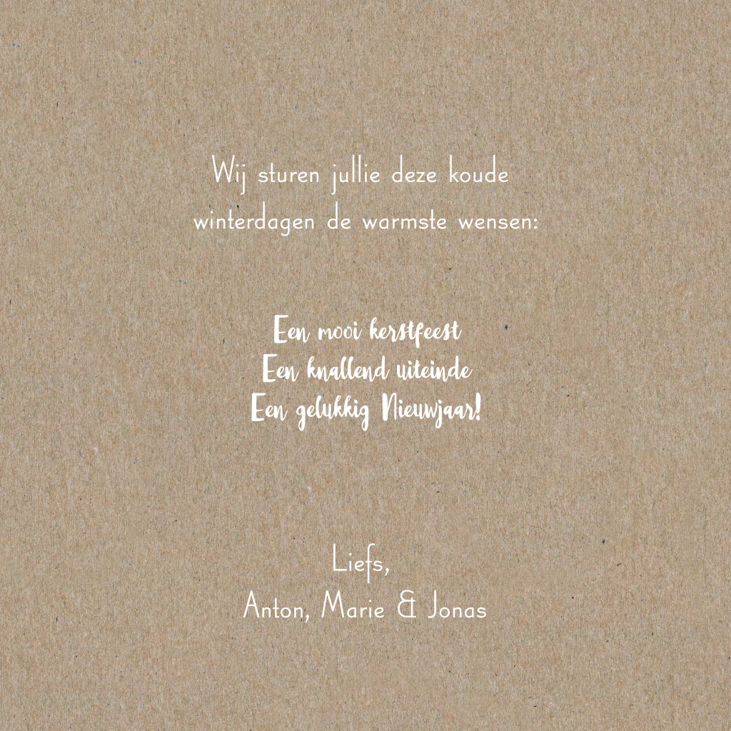 Kerstkaart vierkant in kraft-look met foto en ijskristallen sneeuwvlokken langs de foto.