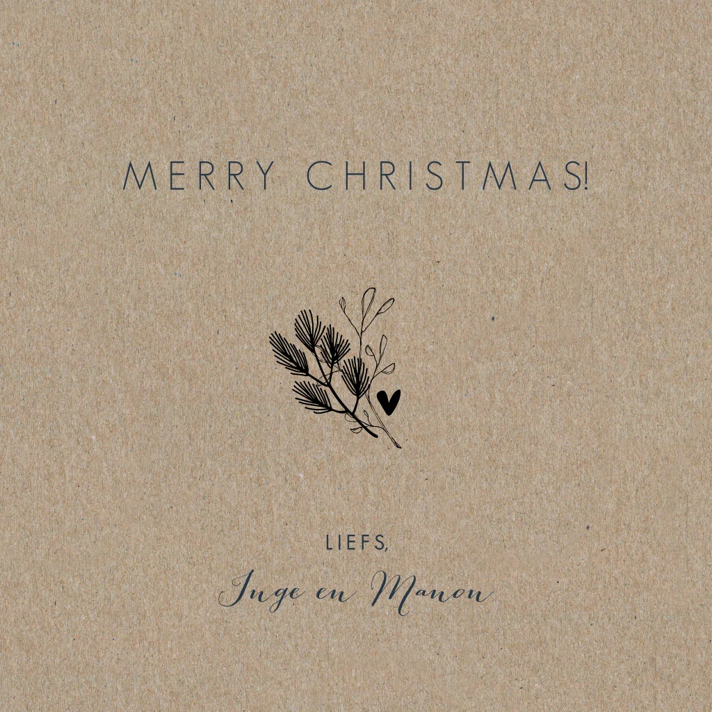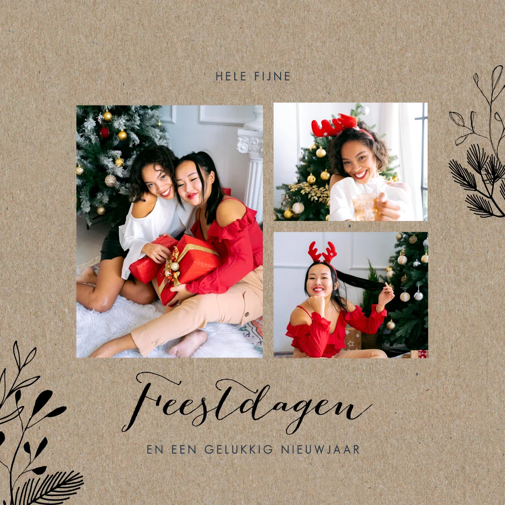Vierkante kerstkaart in kraft-look met gestyleerde zwart getekende takjes links en rechts en ruimte voor een fotocollage met eigen foto's.