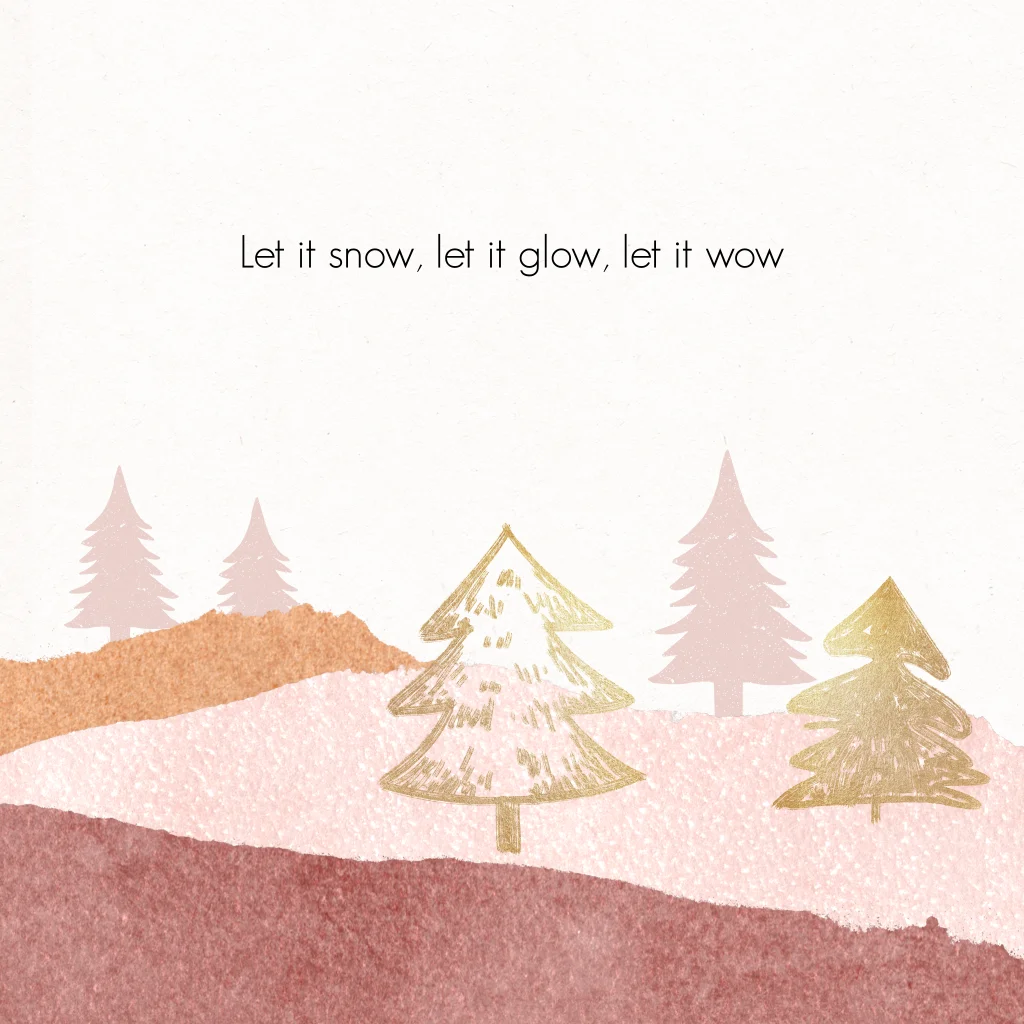 Een lieve kerstkaart met een mooie waterverftekening van kerstbomen in een landschap in roze en goud.