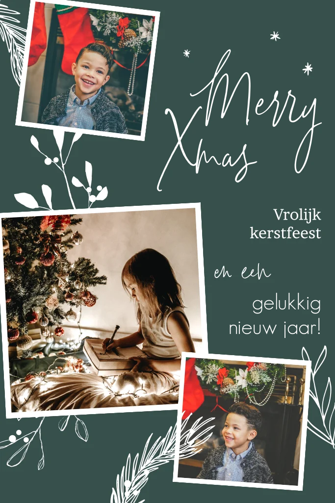 Op deze groene kerstkaart met verschillende takjes is ruimte voor een leuke fotocollage. Door de goudfolie krijgt de kaart een luxe uitstraling. Pas de tekst eenvoudig aan, vervang de foto's voor je eigen foto's en verstuur een mooie kerstkaart naar jullie geliefden!