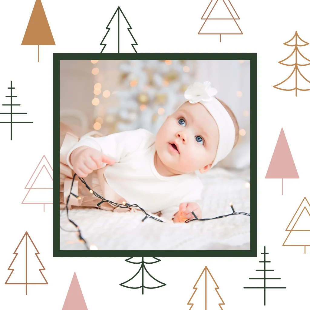 Een moderne vierkante kerstkaart met een foto in het midden die omringd wordt door getekende kerstbomen in verschillende kleuren.