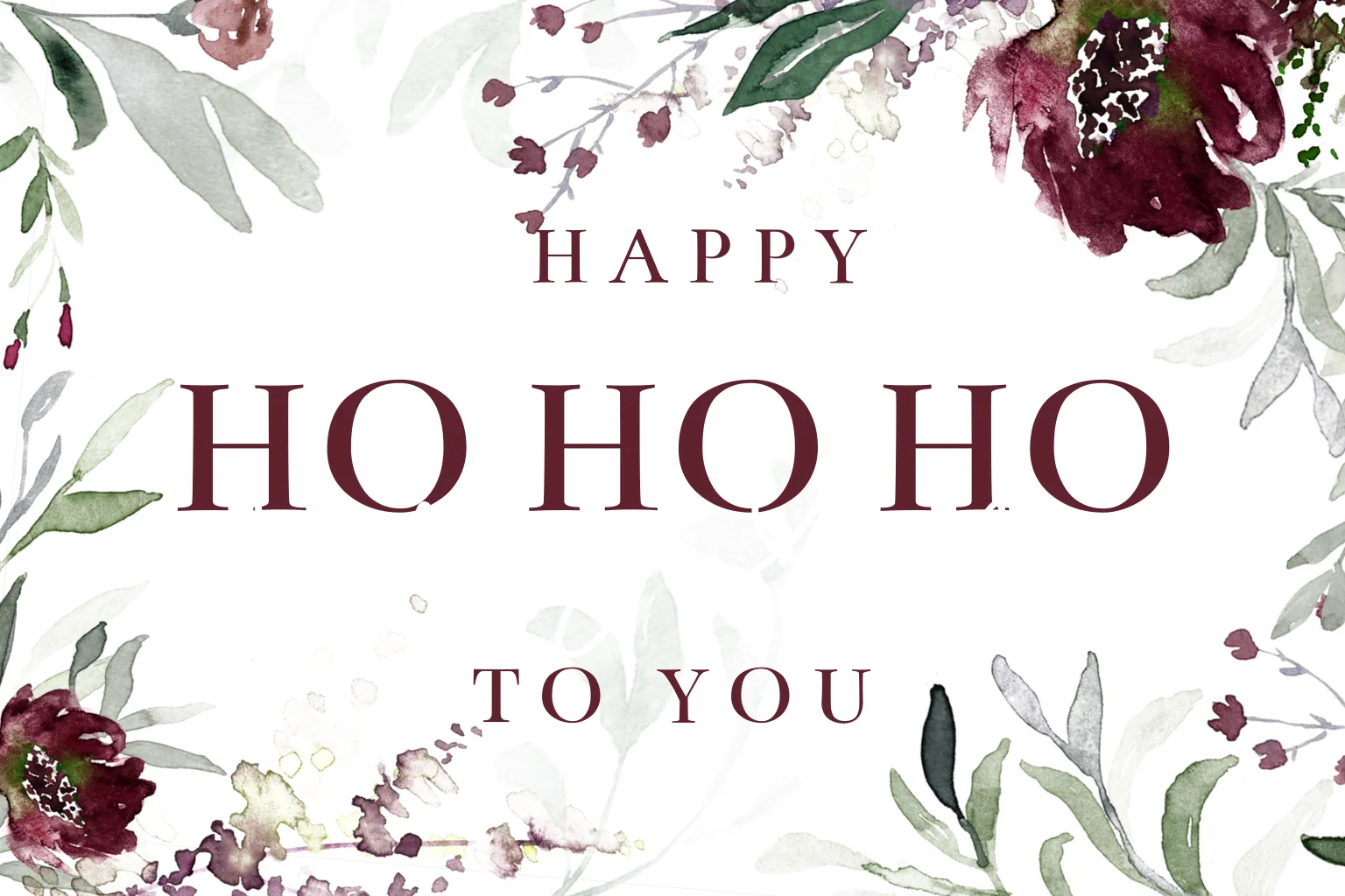 Mooie kerstkaart met botanische tekening aan de rand. De bloemen en takjes zijn in rood en groen en een deel van de tekst staat in goudfolie.