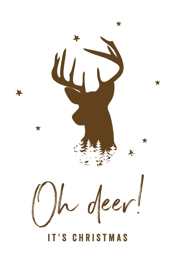 Een originele kerstkaart met het silhouet van een rendier, met sterretjes eromheen. Tekst en silhouet zijn uitgevoerd in bruin, maar in de online editor kun je eenvoudig een andere kleur kiezen.