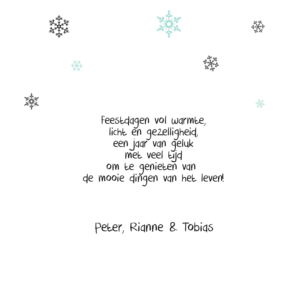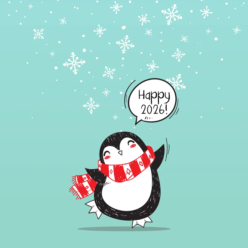 Een fris, winters nieuwjaarskaartje met sterren en een illustratie van een dansende pinguïn. Hoe kun je nou beter het nieuwe jaar beginnen dan met deze vrolijke kaart?