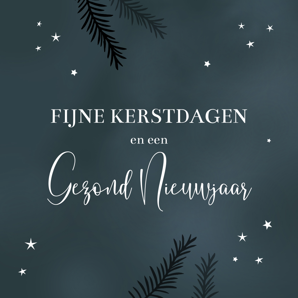 Een stijlvol kerstkaartje met tekst en sterretjes in roséfolie en zwarte dennentakjes op een donkere achtergrond. De binnenkant heeft een vrolijke mintgroene kleur.