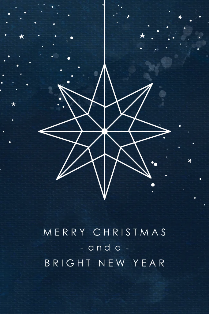 Een stijlvolle kerstkaart met een grote getekende gouden ster op de voorkant. Om de grote ster staan kleinere gouden sterren en witte stippen.