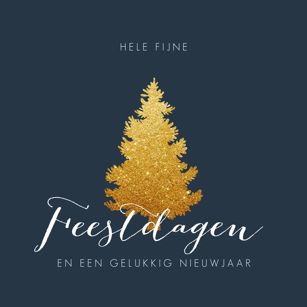 Stijlvolle kerstkaart met een gouden kerstboom en sierlijke tekst op een donkerblauwe achtergrond.