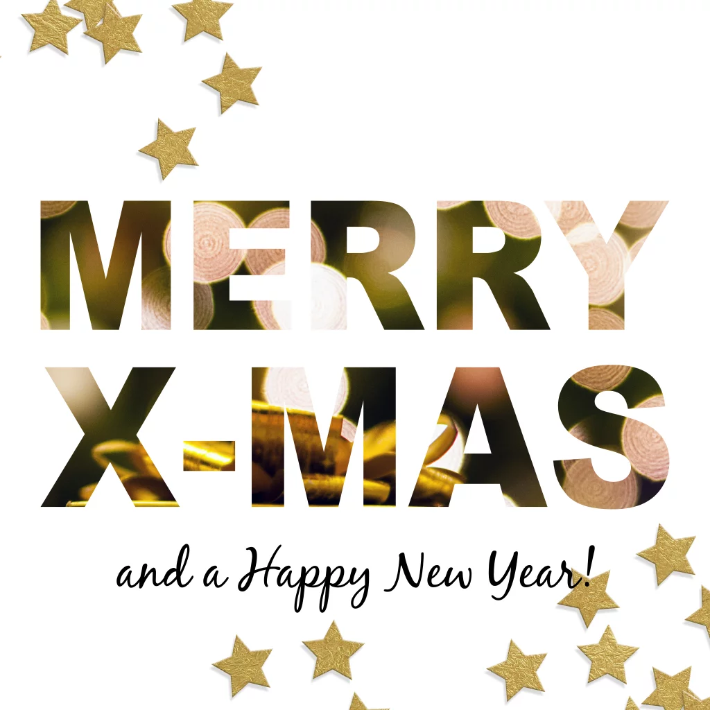 Hippe kerstkaart met goudkleurige sterretjes en in stoere typografie "Merry X-Mas!". Schrijf je eigen kerstwens in de online editor en verstuur deze kaart naar je geliefden!