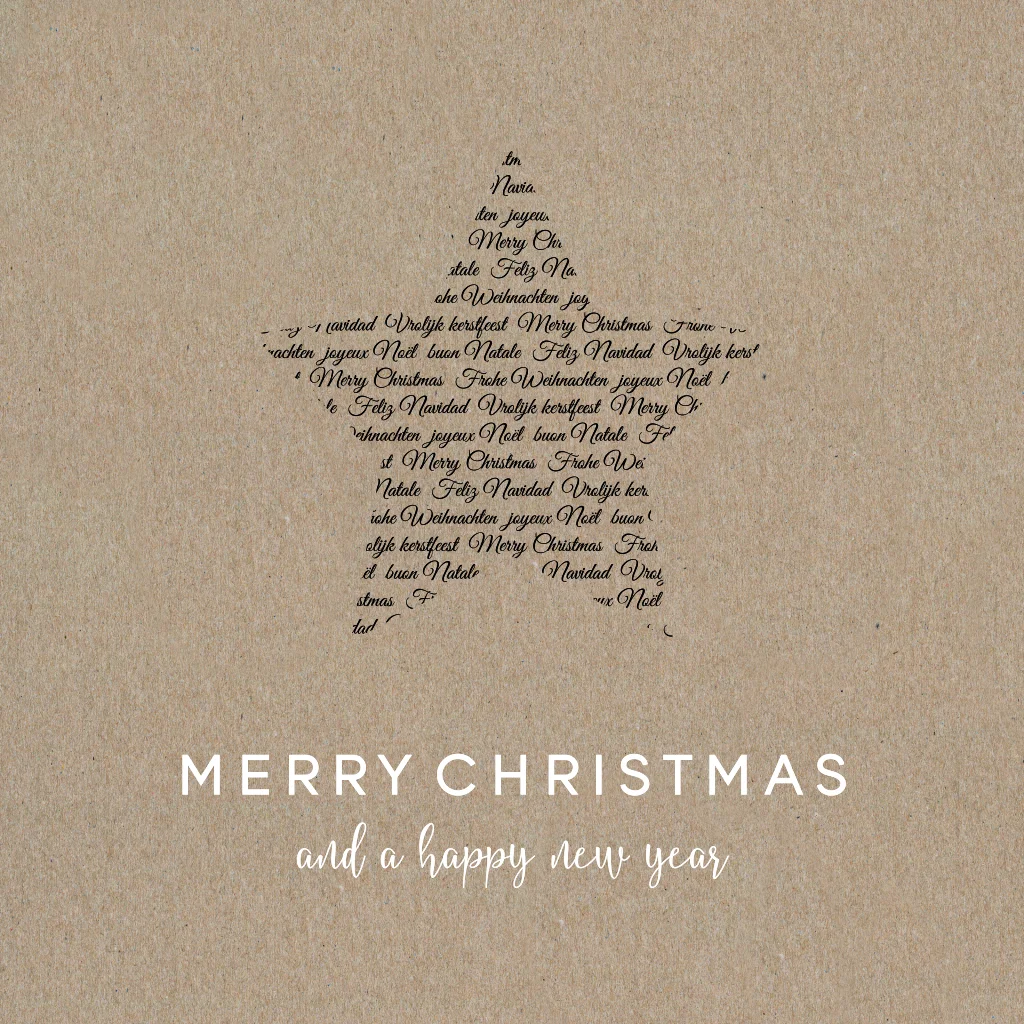 Stoere vierkante kerstkaart van echt kraftpapier. Op de ster in het midden staan verschillende kerstwensen. De tekst eronder is in wit, pas dit naar wens aan in de online editor.