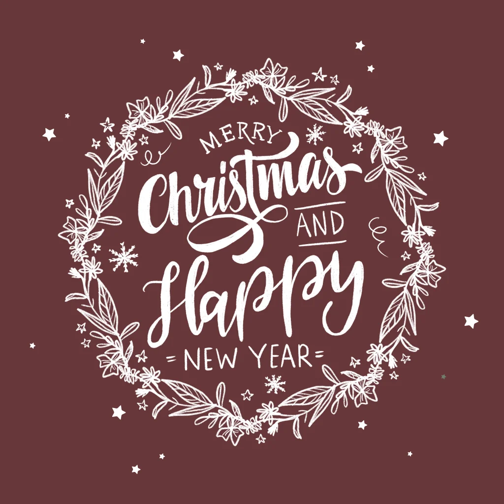 Een vierkante donkerrode kerstkaart met afgeronde hoeken. In het midden leuke typografie in wit met een krans van takjes er omheen.