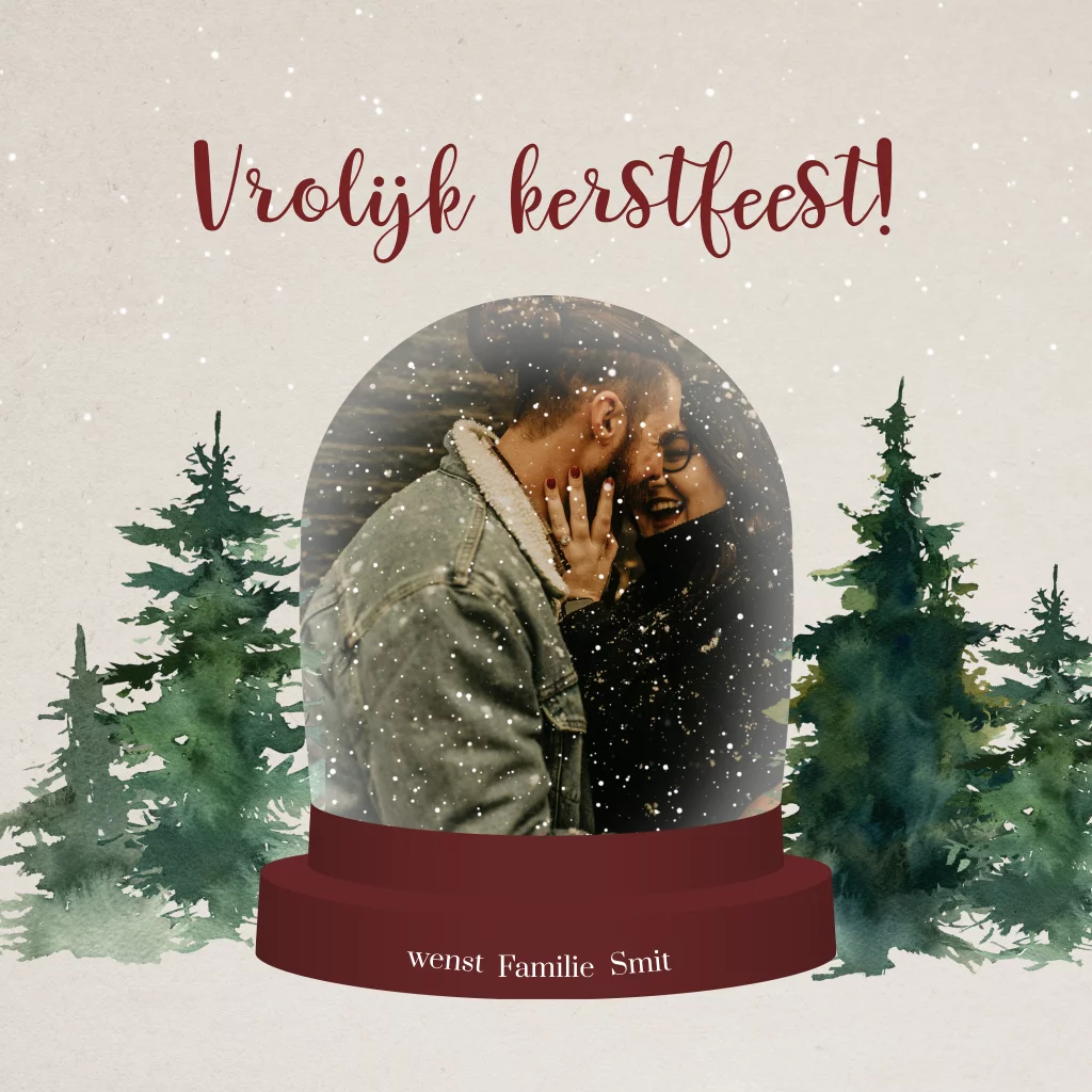 Stuur een originele kerstkaart met een eigen foto en wensfamilie en vrienden een vrolijk kerstfeest. In de sneeuwbol kun je een eigen foto plaatsen, ernaast een tekening van kerstbomen op een beige achtergrond.