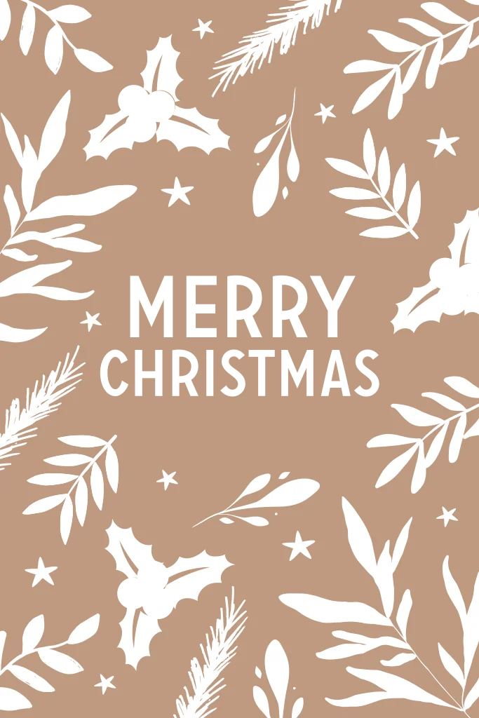 Een vrolijke kerstkaart met kersttakjes in wit en goudfolie op kraft-look papier. Ook op de achterkant staat tekst in goud, maak de kaart naar wens in de online editor.