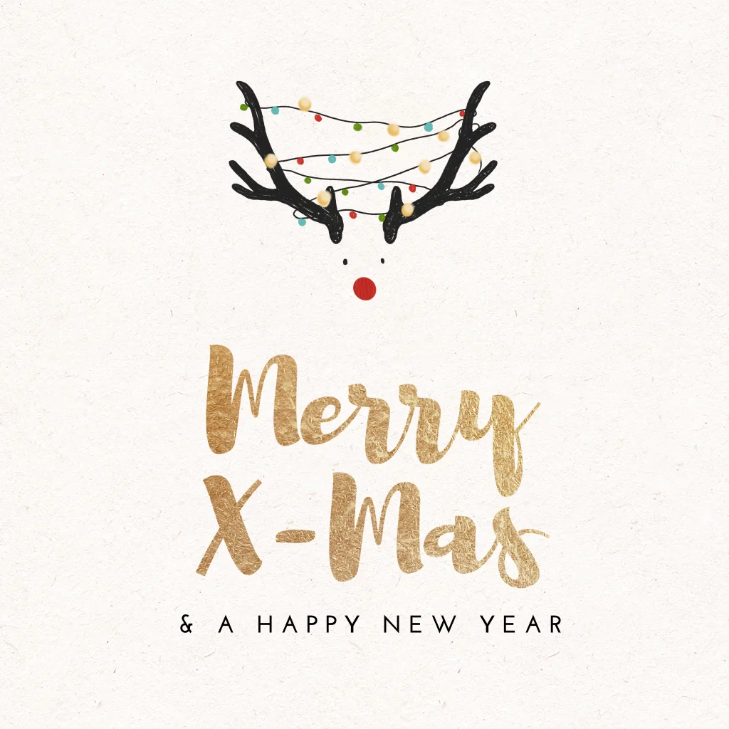 Een vrolijke kerstkaart met een rendier en hippe letters. In het gewei zit een slinger van gekleurde lichtjes. De achtergrond van de kaart is in pastelkleur, pas de tekst naar wens aan in de online editor.
