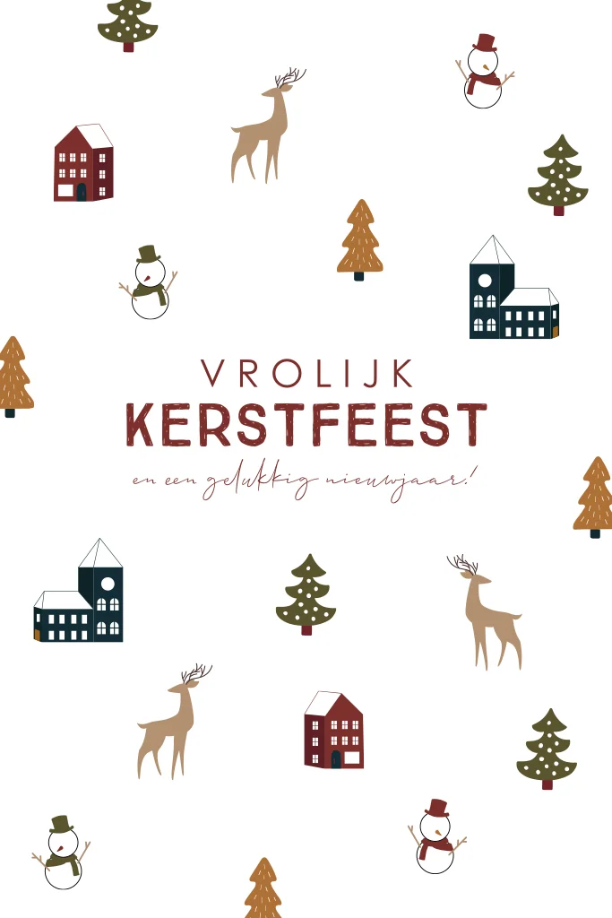 Vrolijke kerstkaart met sneeuwpoppen en rendieren
