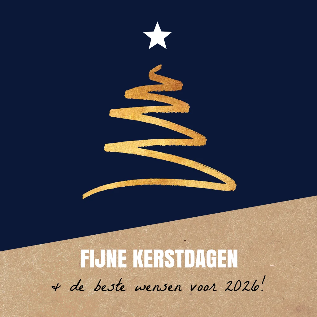 Ben je op zoek naar een hippe zakelijke kerstkaart die je namens het bedrijf aan jullie zakenrelaties kunt sturen? Dan is deze kaart precies wat je zoekt! Op de donkerblauwe kaart met kraft een goudlook kerstboom in strak design met een sterretjespiek. Voeg in de online editor een eigen tekst toe in een trendy lettertype en de kaart is klaar om te verzenden!