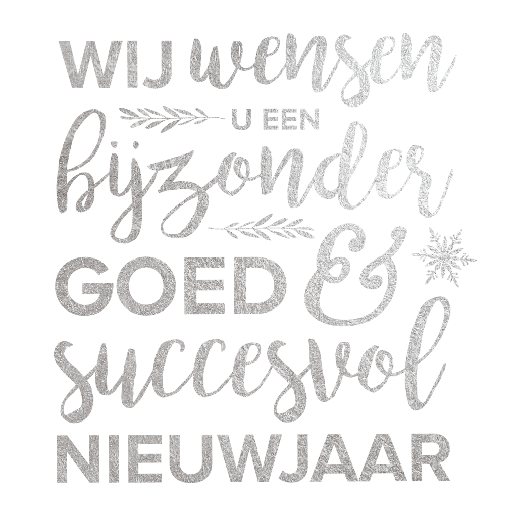 Stijlvolle zakelijke kerstkaart met hippe typografie in zilverkleur. Voeg aan de binnenkant het bedrijfslogo toe, schrijf jullie eigen kerst- of nieuwjaarswens en stuur deze kaart naar je zakenpartners. In de online editor pas je de kaart gemakkelijk naar wens aan.