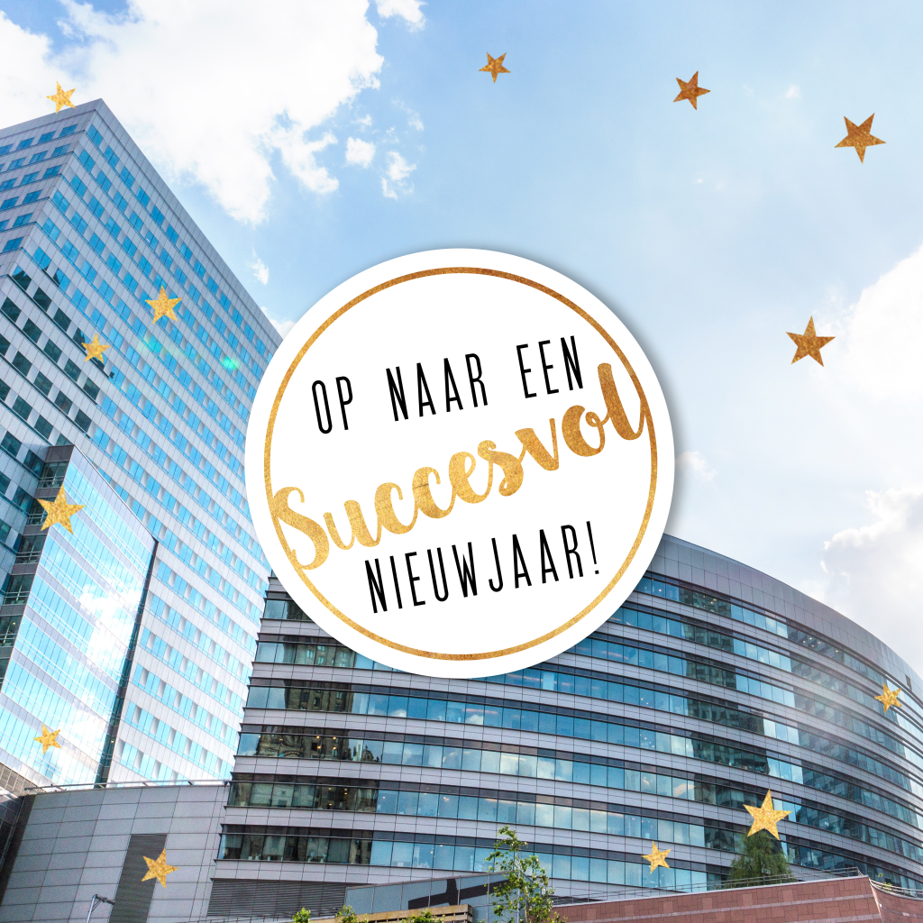 Hippe zakelijke nieuwjaarskaart met sterren in goudlook. Vervang de foto op de achtergrond voor een foto van jullie eigen bedrijf en maak zo een unieke kaart! Schrijf aan de binnenkant een persoonlijke kerstwens en stuur naar je zaken relaties.