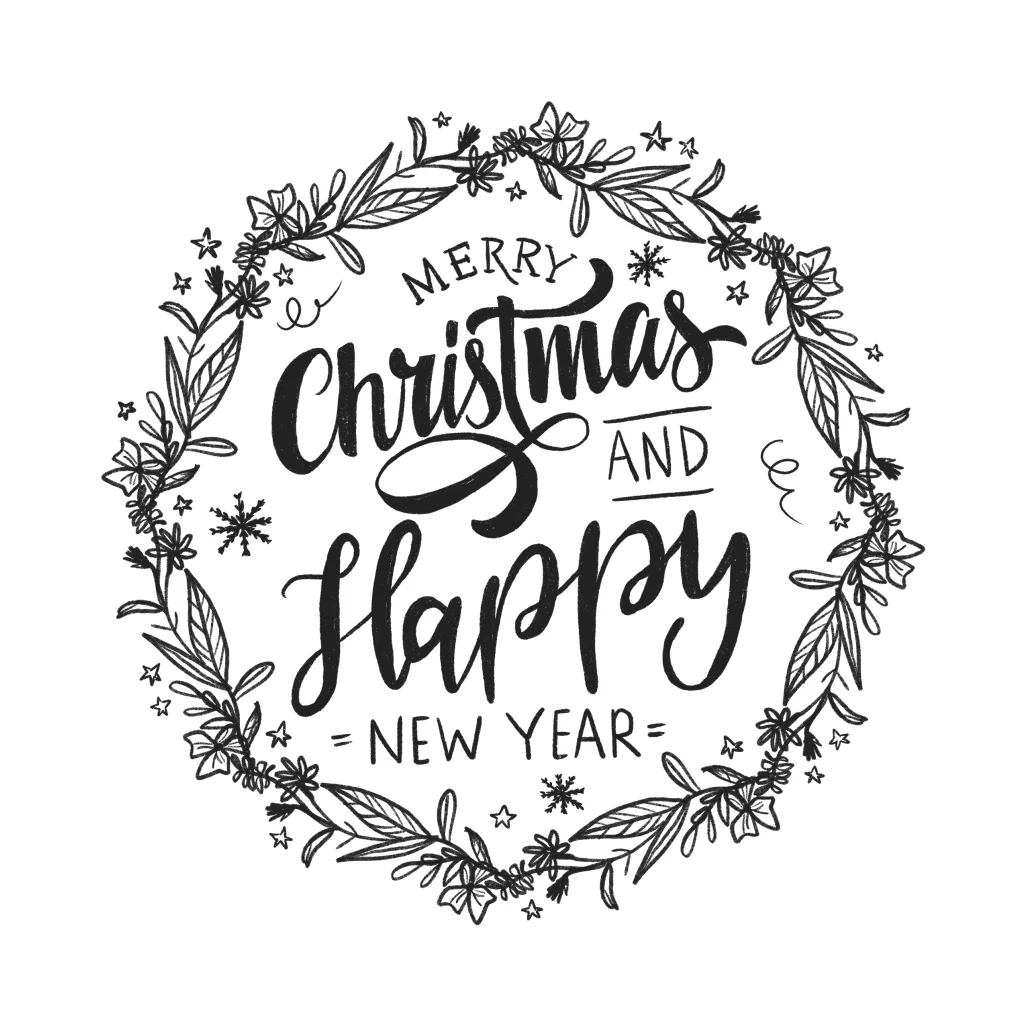 Vrolijke kerstkaart in het zwart wit met illustratie van een krans en leuke sterretjes. Pas het ontwerp eenvoudig aan in de online editor.