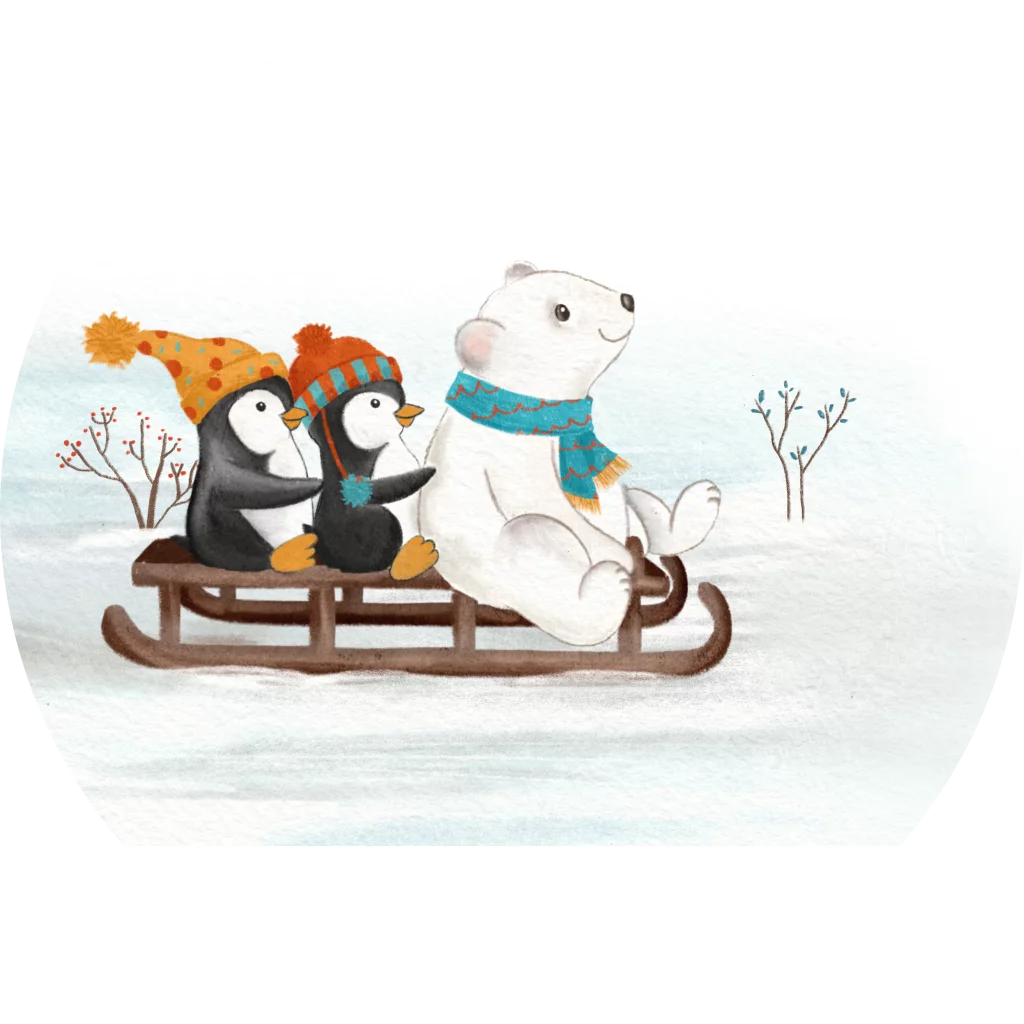 Sluitzegel kerstsfeer met schattige ijsbeer en pinguins op een slee