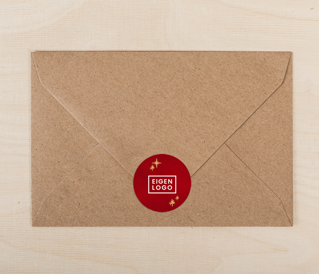 Zakelijke sticker in helderrood met gouden sterren, in het midden is ruimte om een eigen logo te uploaden. Afmeting sticker: 44 mm - 20 stuks per stickervel.