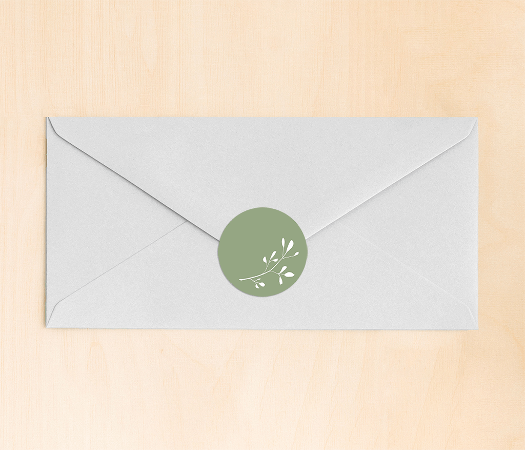 Olijfgroene kerststicker met een tekening van een wit takje onderaan. Per vel 25 stuks, afmeting Ø 35MM.
