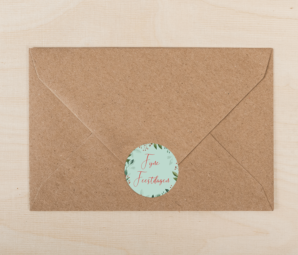 Vrolijke mintgroene kerststicker met takjes en rode besjes langs de rand. De tekst staat in sierlijk handschrift in bijpassend rood. Per vel 25 stuks, afmeting Ø 35MM.