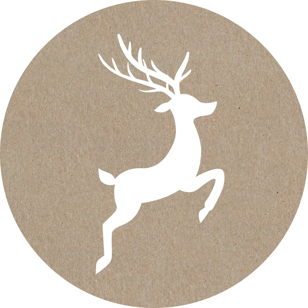 Ronde kerststicker in kraft-look met een wit rendier. Per vel 25 stuks, afmeting Ø 35MM .