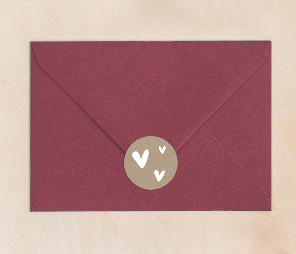 Ronde sticker in kraft-look met drie witte hartjes, per vel 25 stuks, afmeting Ø 35MM.