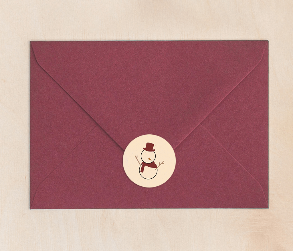 Leuke beige kerststicker, op deze ronde sticker staat een sneeuwpop getekend met rode hoed en sjaal. Per vel 25 stuks, afmeting Ø 35MM.