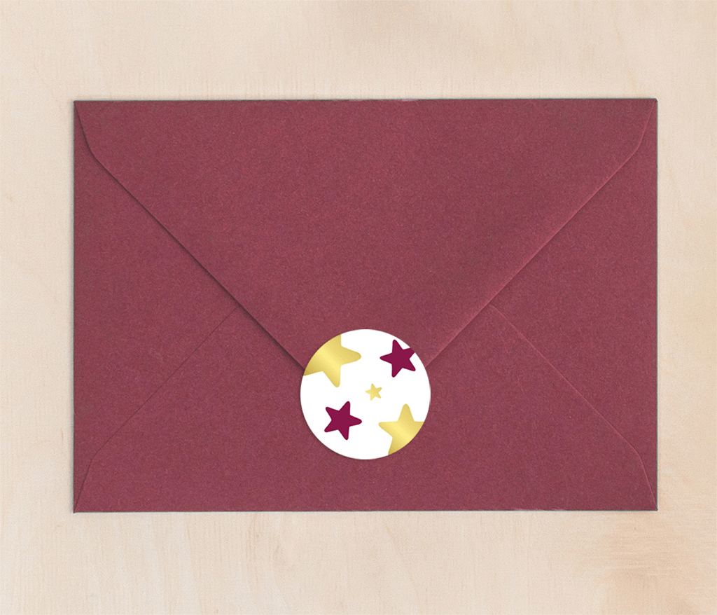 Vrolijke witte kerststicker met sterren in fuchsia en goudfolie. Per vel 25 stuks, afmeting Ø 35MM.