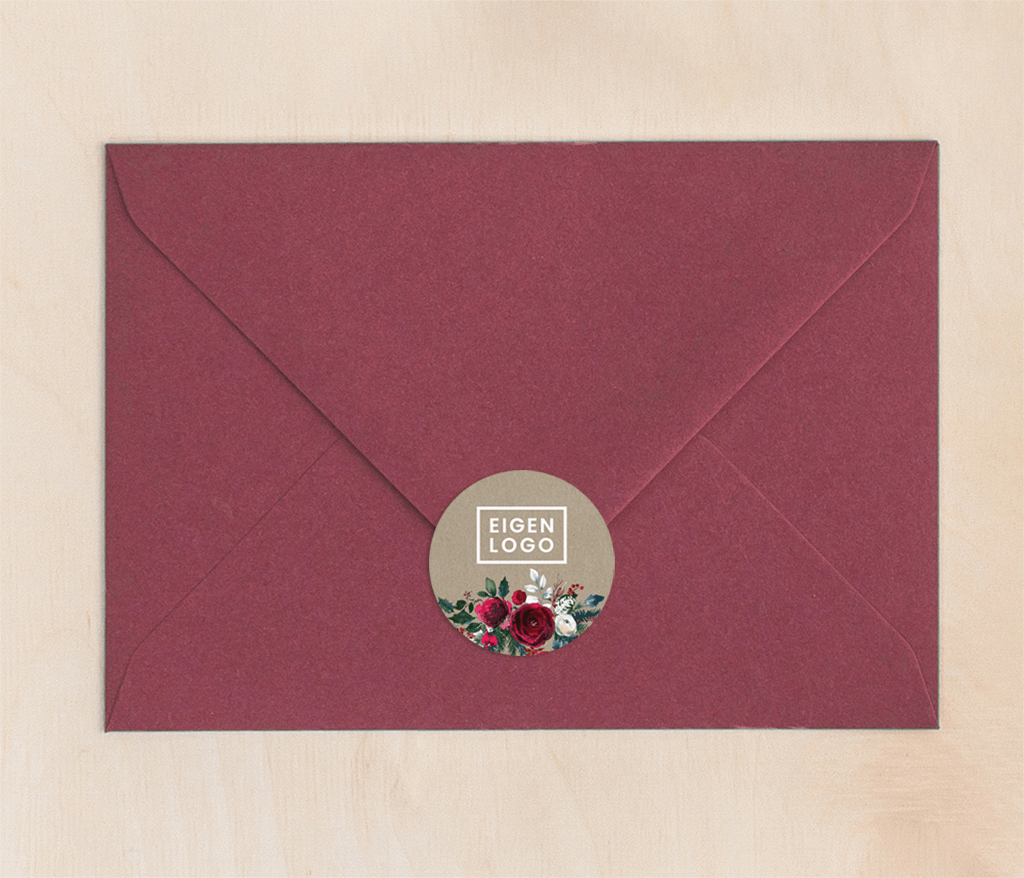 Sticker in kraftlook met onderaan een rand van rode rozen, erboven is ruimte om een eigen logo te plaatsen. Afmeting: 44 mm, 20 stuks per stickervel.