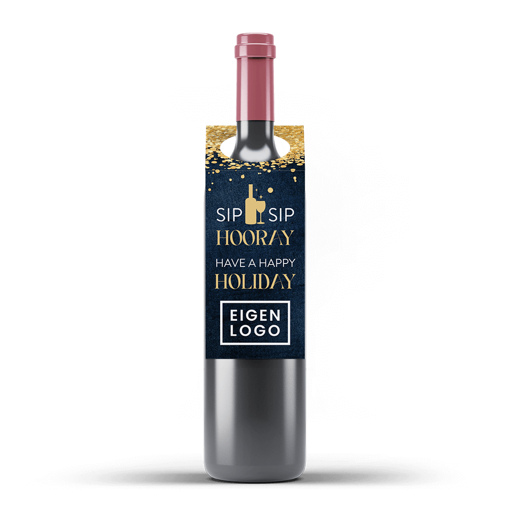 Feestelijke wijnfleshanger met logo en goud | set van 3