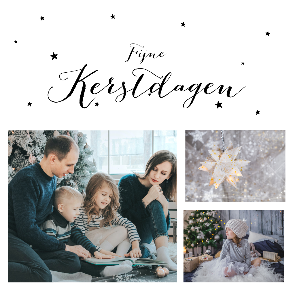 Een kerstkaart om zelf te ontwerpen, met sterretjes en trendy typografie. Personaliseer dit kaartje door er drie leuke foto's op te zetten. Ook kun je het lettertype en de kleuren aanpassen.