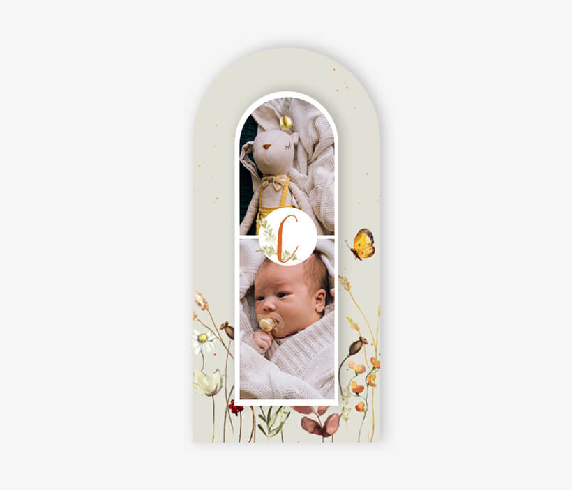 Origineel label geboortekaartje in boogvorm. Op de beige achtergrond staan kleurrijke veldbloemen en een vlinder, de tekst is in hoogglans, dat zorgt voor een luxe accent. Op het losse label met initiaal kunnen mooie foto's van de kleine worden geplaatst, in de online editor maak je de kaart helemaal naar eigen wens, lief kaartje!