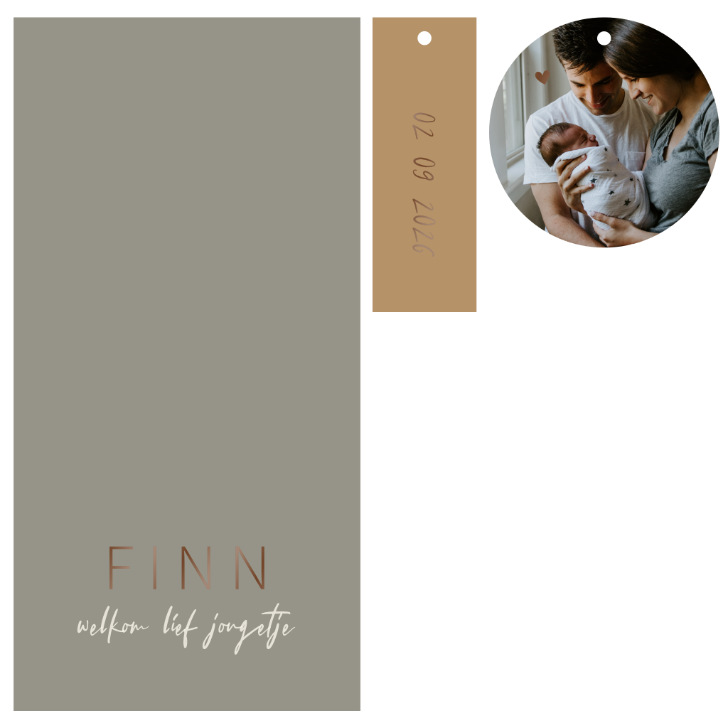 Stoer labelkaartje om de geboorte van jullie zoontje aan te kondigen! De naam staat in moderne letters in hoogglans, dat komt mooi naar voren op de grijze achtergrond. Op het ronde label kun je een mooie foto uploaden in de online editor.