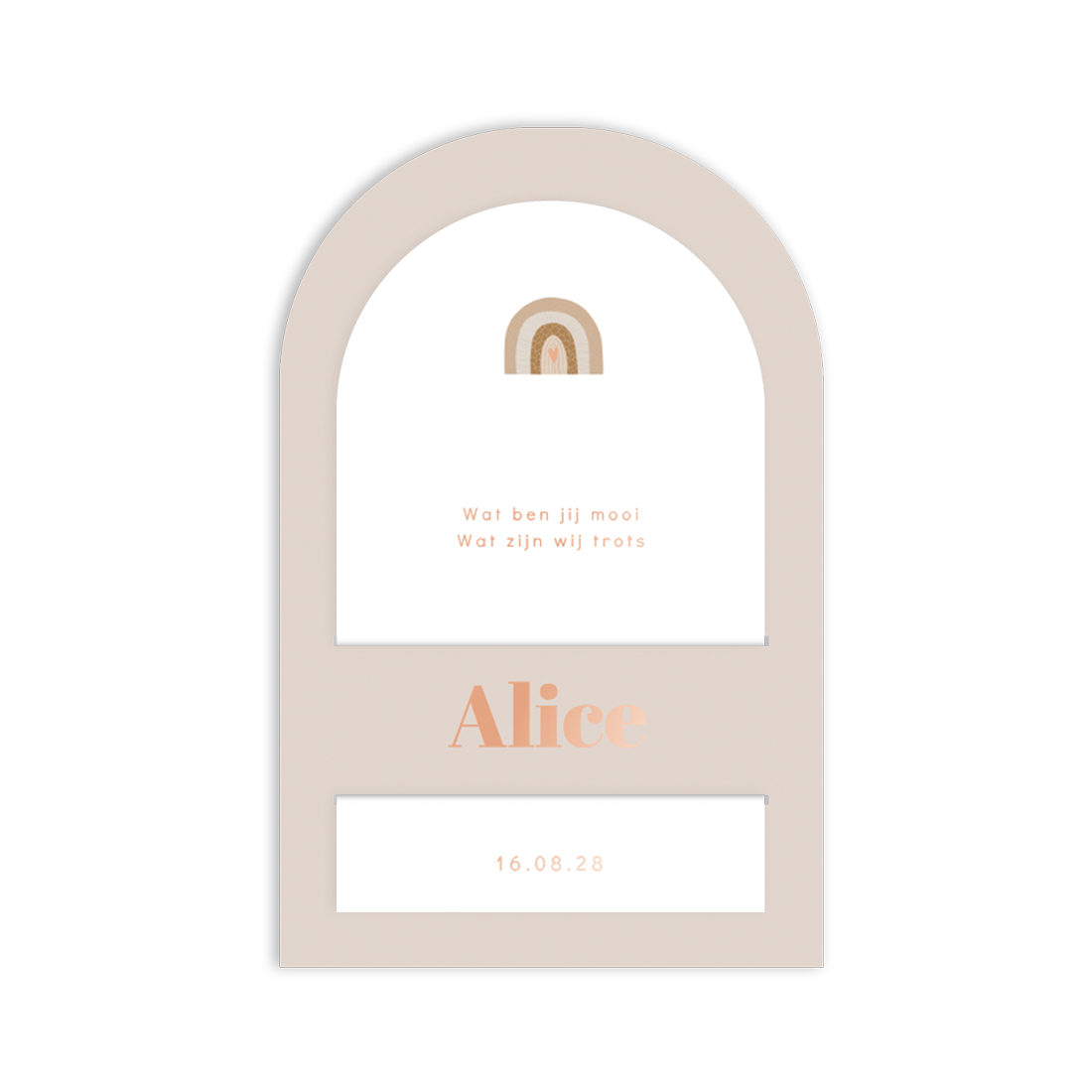 Een prachtig geboortekaartje die bestaat uit twee losse kaarten die je samen kan voegen. De naam van jullie dochtertje staat in roségoudfolie geschreven en er staat een klein regenboogje op.