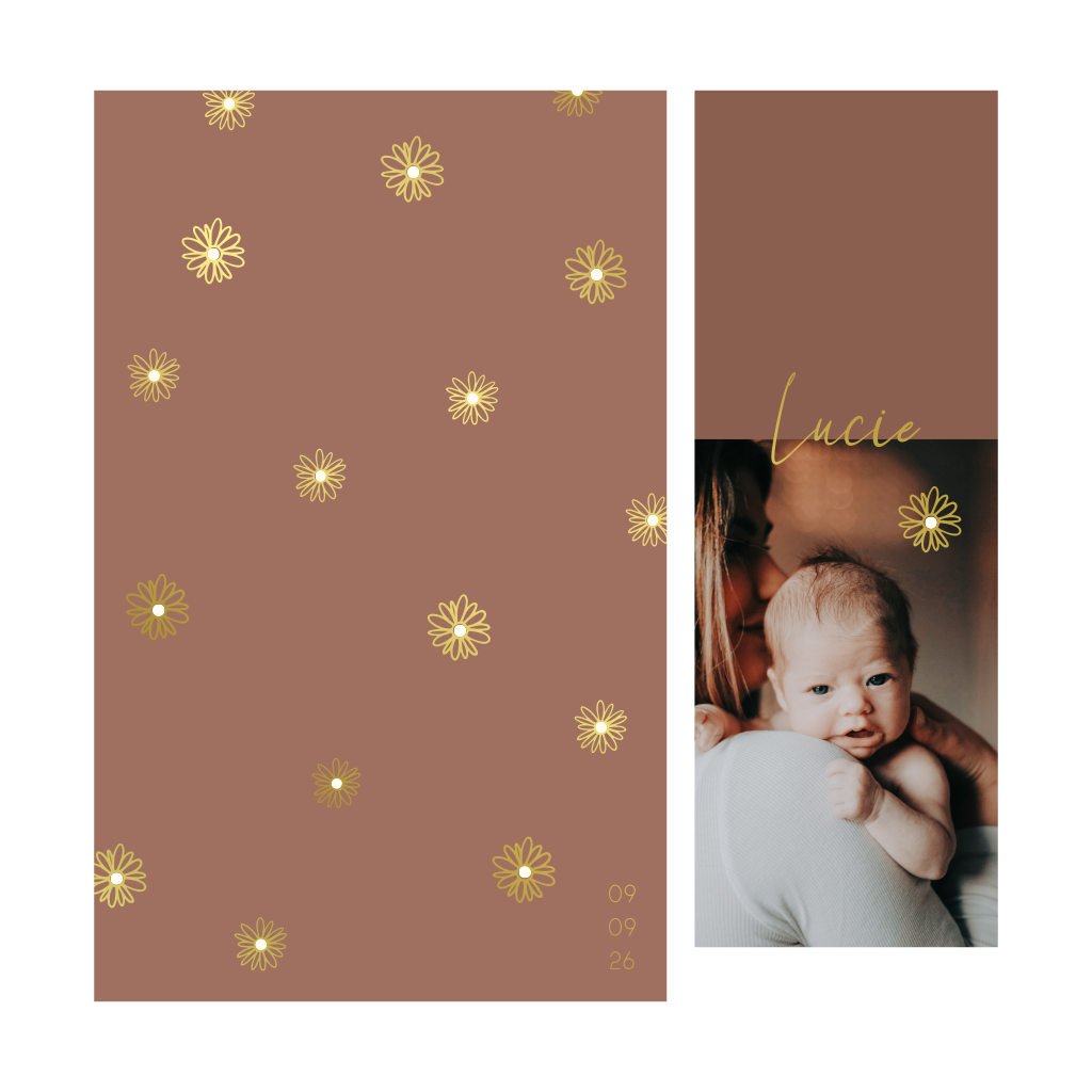 Superlief geboortekaartje in oudroze met getekende bloemetjes in goudkleur. Op het label kun je een mooie foto van jullie kleintje uploaden in de online editor; de naam staat in goudfolie, een luxe accent.