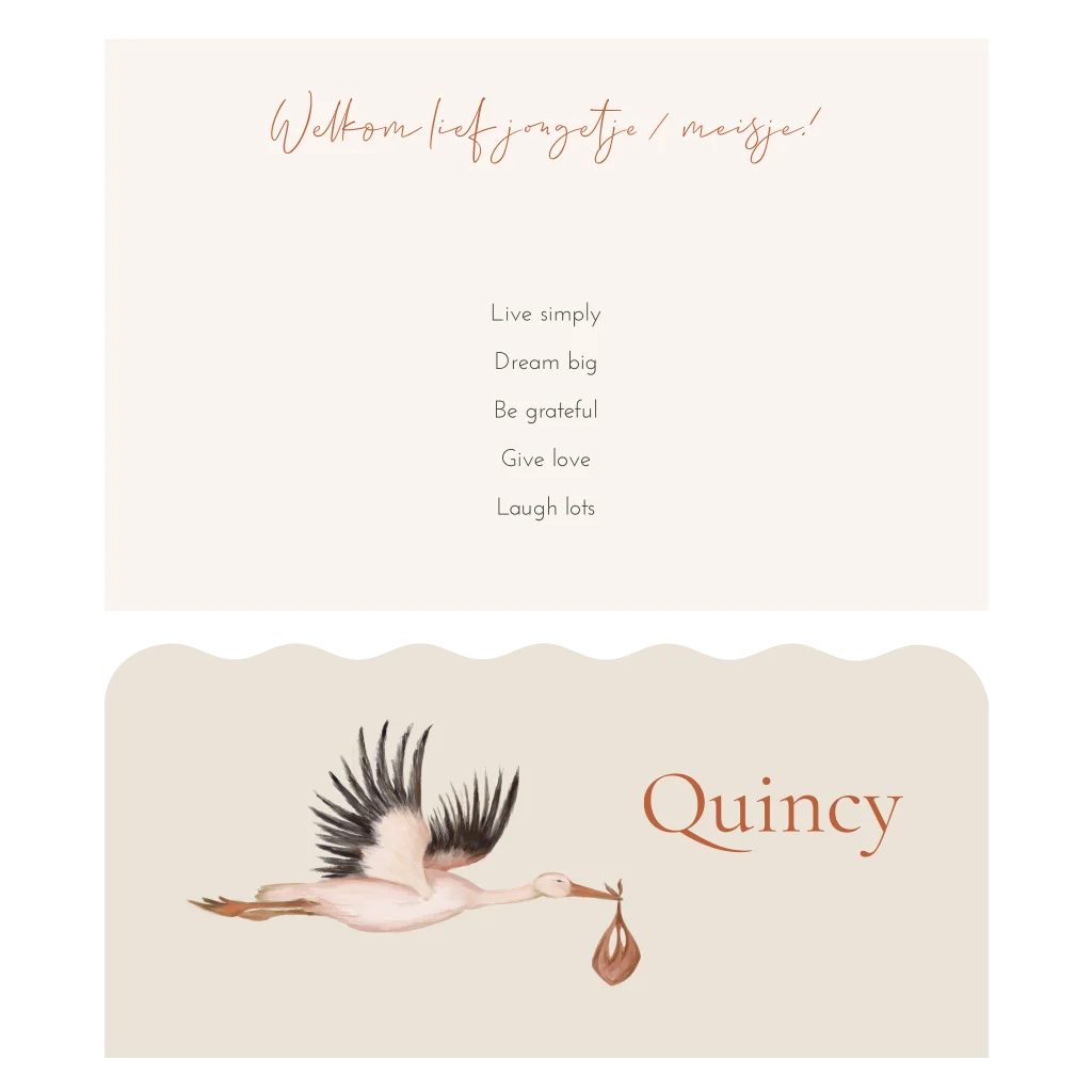 Een mooi unisex geboortekaartje dat bestaat uit twee delen waarvan de kleinste kaart een golvende rand heeft en een lieve illustratie van een vliegende ooievaar. Pas deze tweedelige kaart naar eigen idee aan door bijvoorbeeld een foto toe te voegen van jullie kindje. Bevestig de kaarten met een leuke paperclip of een touwtje of koordje, ook verkrijgbaar via onze site.