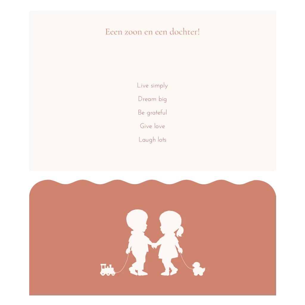Tweedelig geboortekaartje tweeling met silhouetjes en golvende rand
