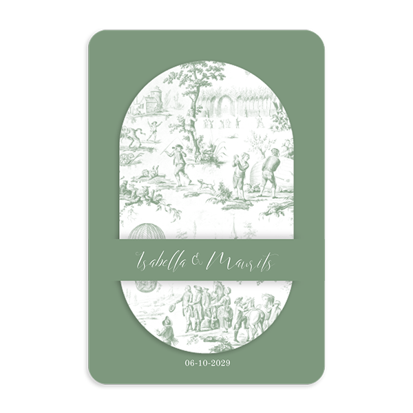 Chique tweedelige kaartenset in Bridgerton stijl in groen met wit. Een chique kaart die je geheel naar wens kunt aanpassen in onze online editor.