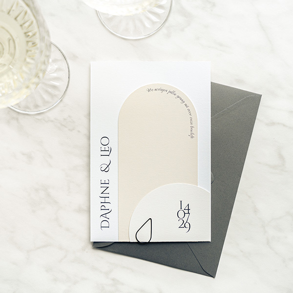 Moderne trouwkaart in boogvorm, in beige en zwart.