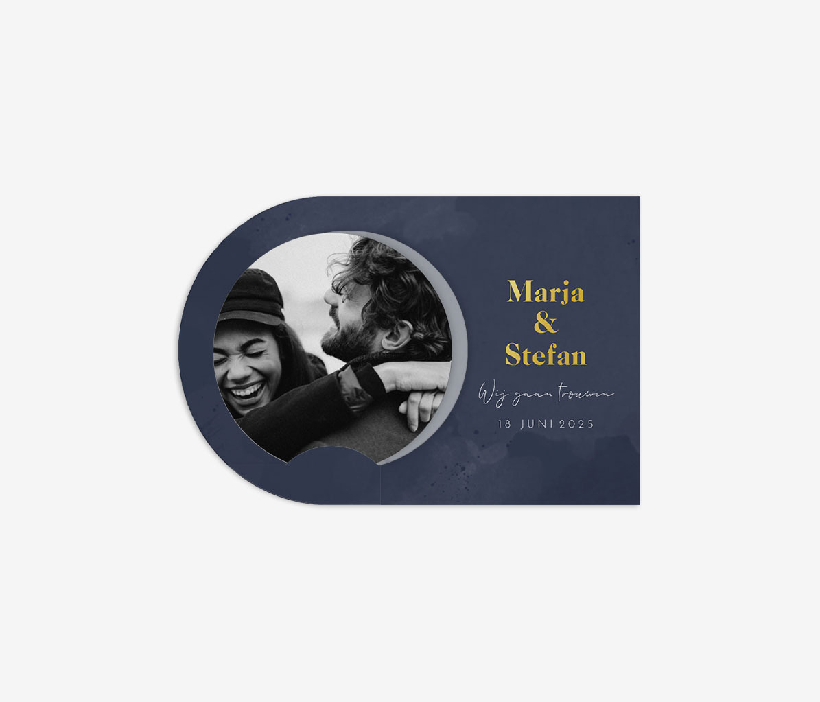 Een bijzondere trouwkaart met donkerblauwe achtergond en goudfolie tekst. De kaart heeft twee ronde stans kaartjes waar tekst en een foto van jullie als stel op staat.