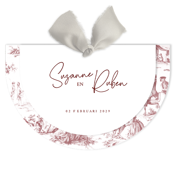 Trouwkaart in orginele halfronde vormen met een mooi rood getekend patroon in Bridgerton stijl.