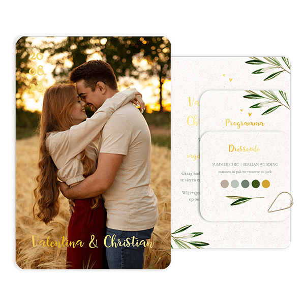 Trouwkaart in 3-delig met foto, olijftakjes en goudfolie.