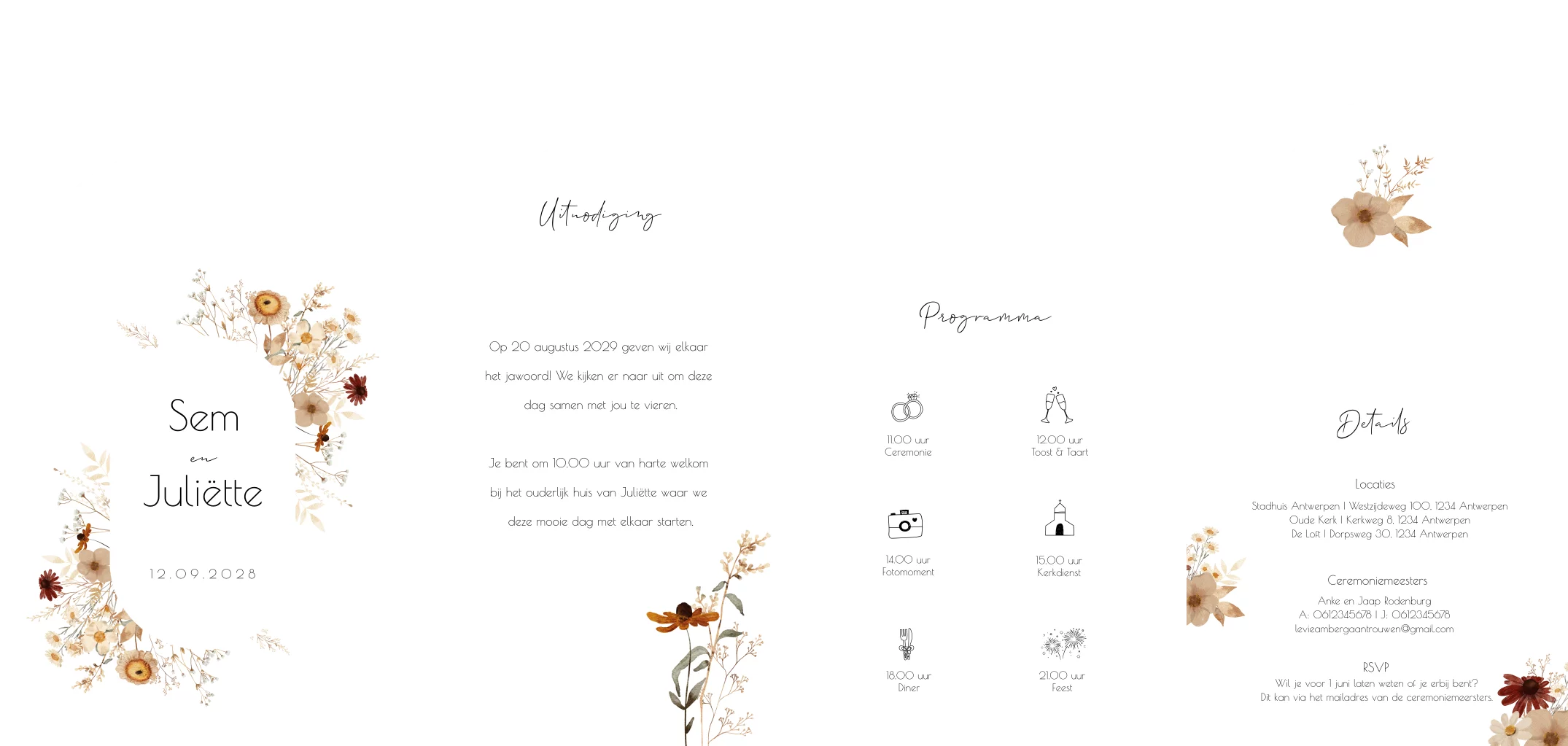 Pocketfold set bruiloft trouwkaarten romantische bloemen aardetinten