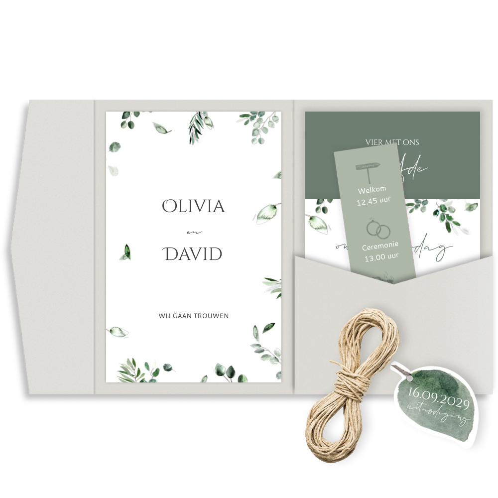 De groene kaart schuif je als eerste in de pocket. Daarvoor komt een kleiner kaartje met de bedschrijving van de bruiloft. Als laatste steek je het strookje met het programma in de pocket. Het labeltje in de vorm van een blaadje - met een handig gaatje - gebruik je om de pocketfold mee dicht te strikken. Je kunt kiezen uit een van onze touwtjes of koord.